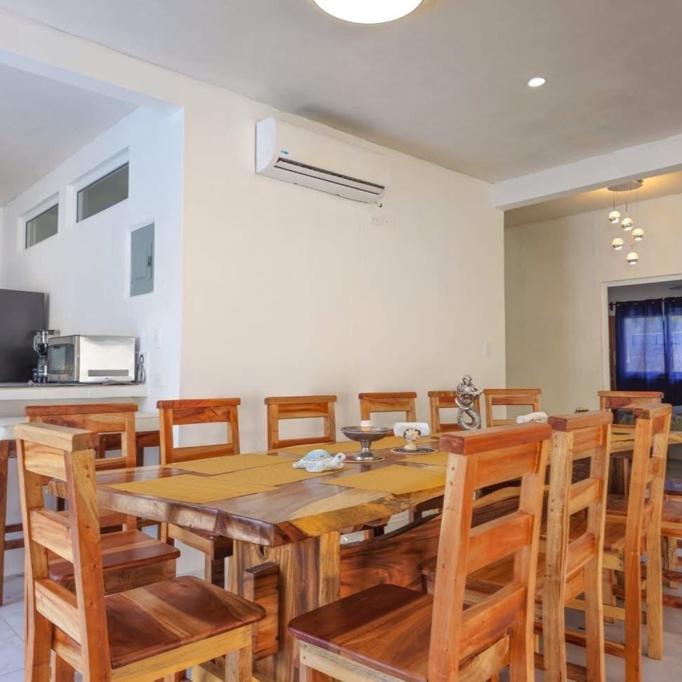 La propiedad cuenta con cuatro habitaciones con aire acondicionado, equipadas con ocho camas matrimoniales y seis camas en literas, además de tres baños completos, dos dentro de la casa y uno de servicio. Dispone de sala, comedor y cocina totalmente equipada, con aire acondicionado en la sala y cocina, brindando comodidad durante toda la estadía.
